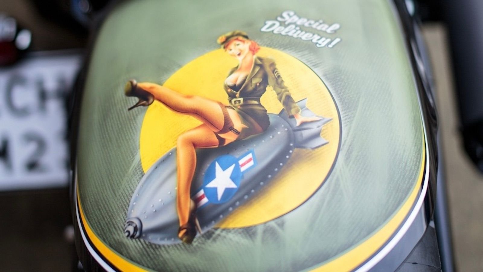 Thanks to its matte military green paint job and the familiar logo on the tank, the influence behind this build is pretty obvious. But if that isn't enough, there's also a cool period painting on the rear fender that pays homage to war birds from the past, too.