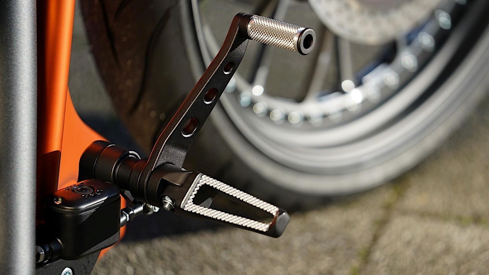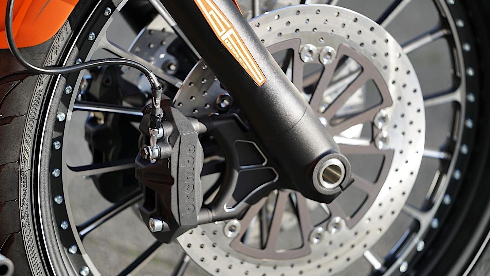That laundry list includes a single swingarm with a huge perimeter brake, fork bridges with an integrated Breakout speedometer, a DLC coated fork, and Brembo brakes, which both look good and add a nice bit of functionality to this gorgeous riding machine.